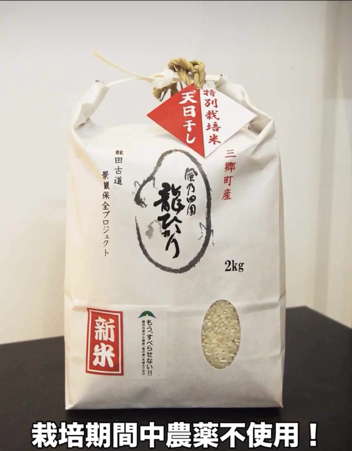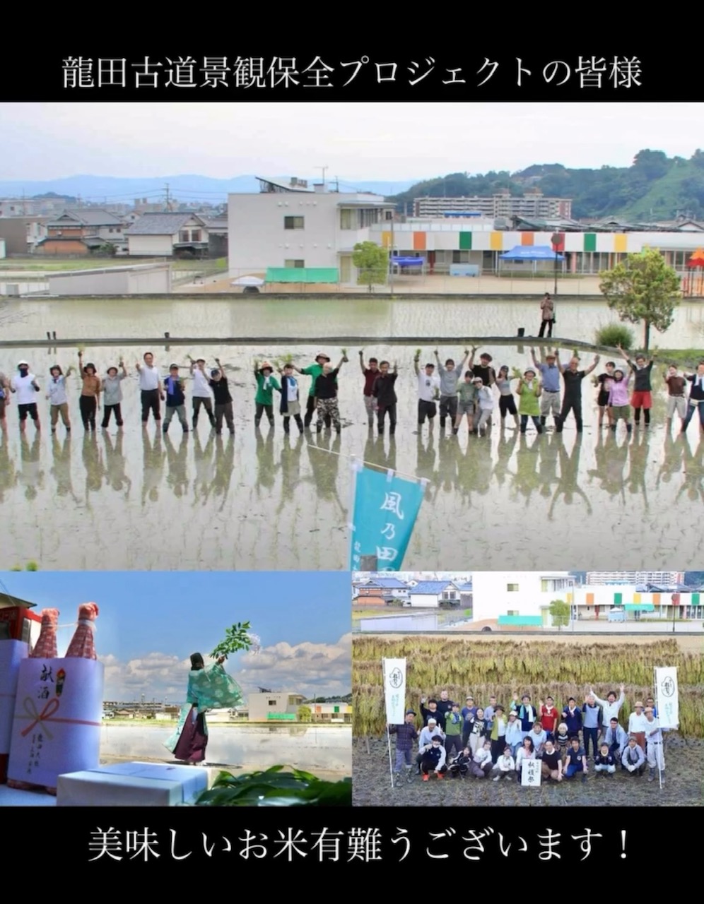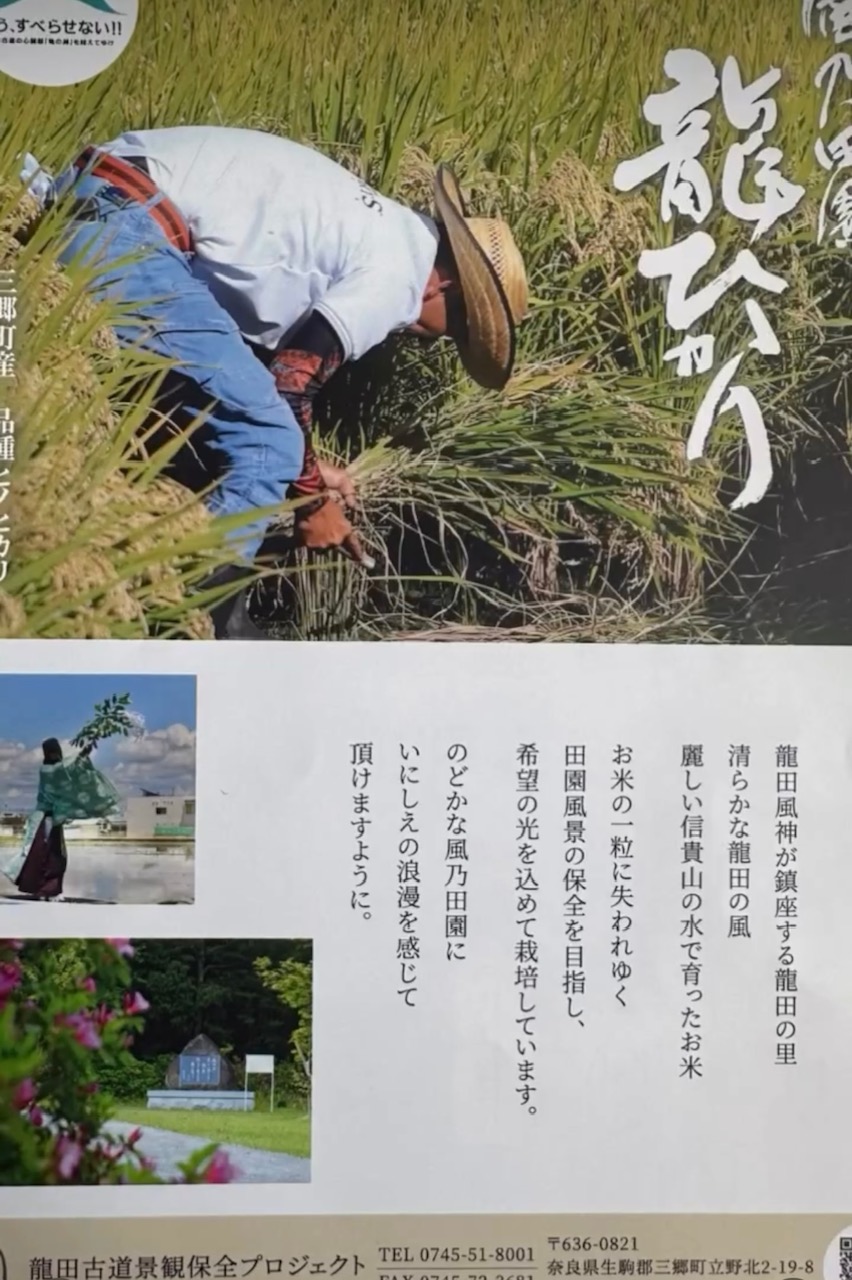 龍田古道景観保全プロジェクトの活動で、天日干し、蓮華の鋤込みをした特別栽培米(栽培期間中農薬不使用)、龍田の里で米作りをする協力農家さんが丹精込めて作ったお米です。