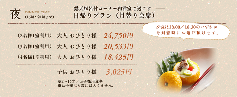 ・ 夕食は18:00、18:30からのいずれかを到着時にお選びいただけます。