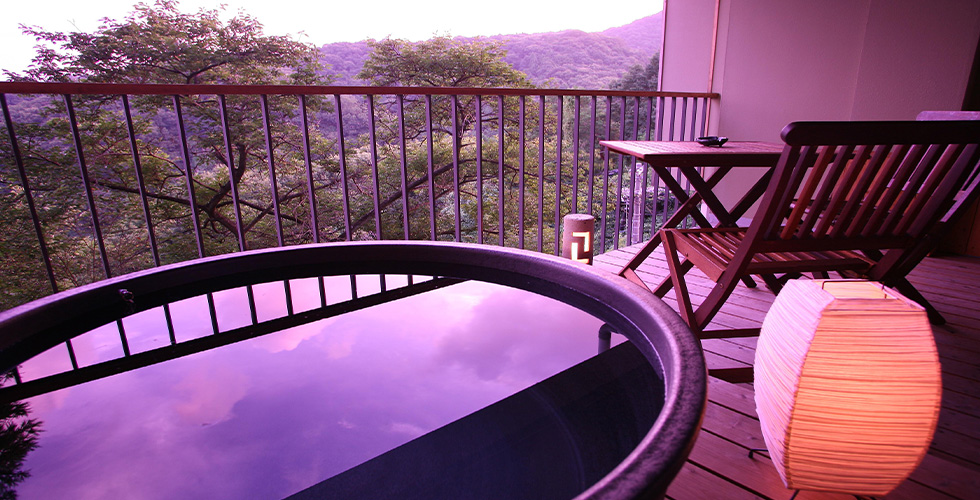 全室山側に面した、テラスに露天風呂を配した和室です。